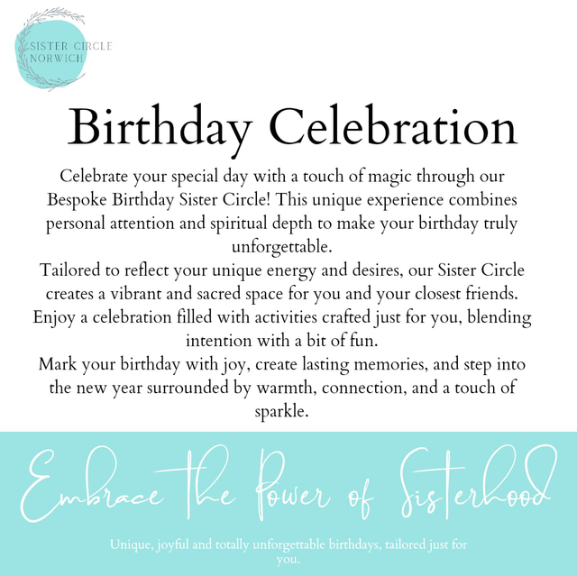 Celebrate your special day with a touch of magic through our bespoke Birthday Sister Circle! This unique experiance combines personal attention and spiritual depth to make your birthday truly unforgettable.